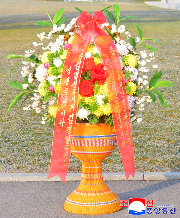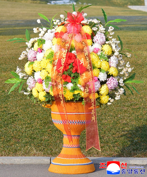 위대한 수령 김일성동지 와 위대한 령도자 김정일동지 의 동상에 우리 나라 주재 외교단 꽃바구니 진정