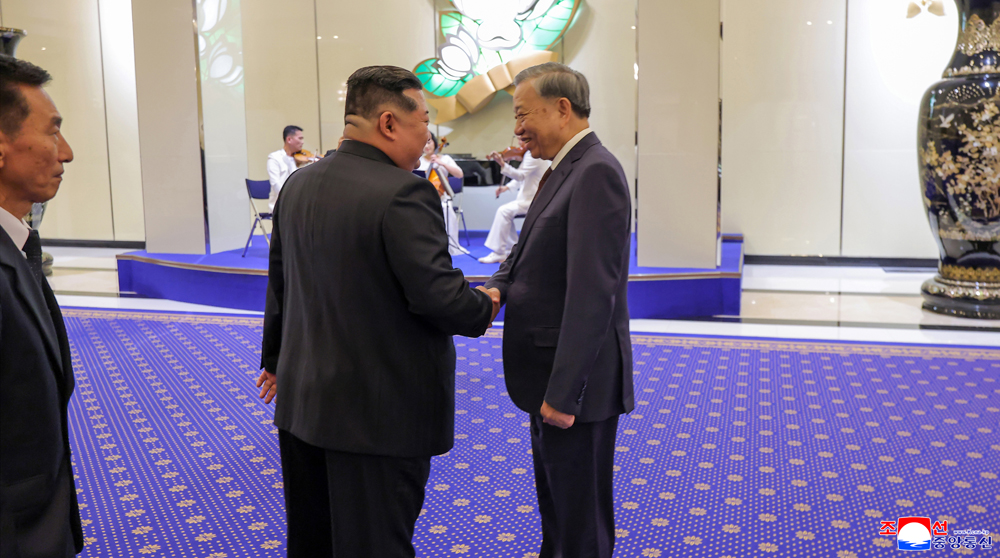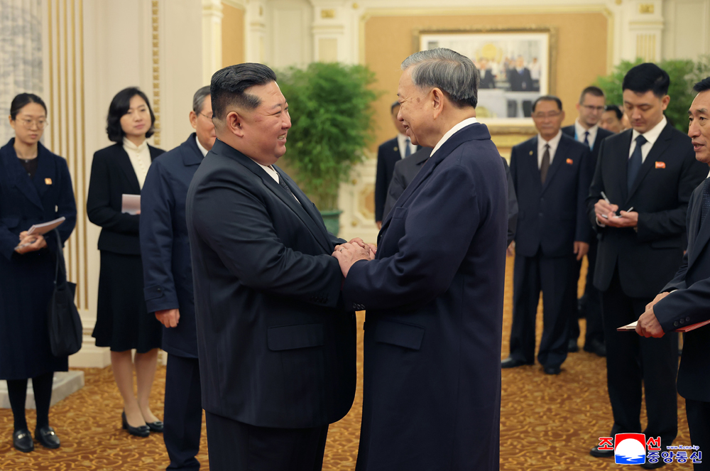 경애하는 김정은동지 께서 윁남공산당 중앙위원회 총비서 또 럼동지와 회담하시였다