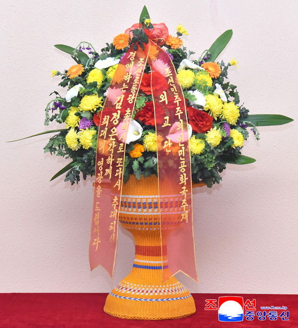 경애하는 김정은동지 께 우리 나라 주재 외교단이 꽃바구니와 축하편지를 드리였다