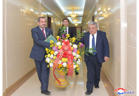 꽃바구니와 축하편지를 26일 인민무력상 륙군대장 노광철동지에게 무관단 단장인 알렉쎄이 바르뚜쏘브 로씨야련방대사관 무관이 전달하였다.(끝)