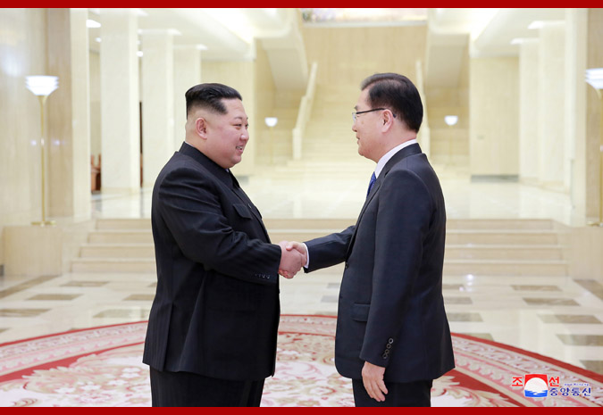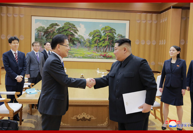 Respected Supreme Leader Kim Jong Un, chairman of the Workers’ Party of Korea(WPK), chairman of the State Affairs Commission of the DPRK and supreme commander of the Korean People’s Army, met members of the delegation of the special envoy of the south Korean president who arrived in Pyongyang on Monday.