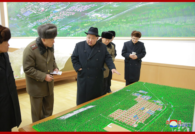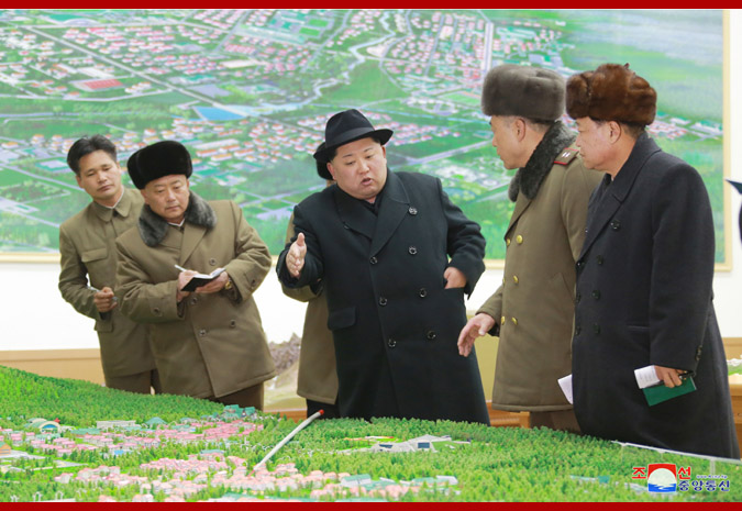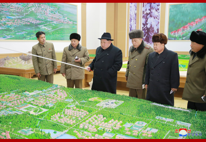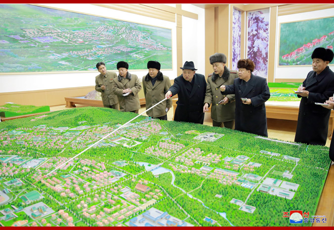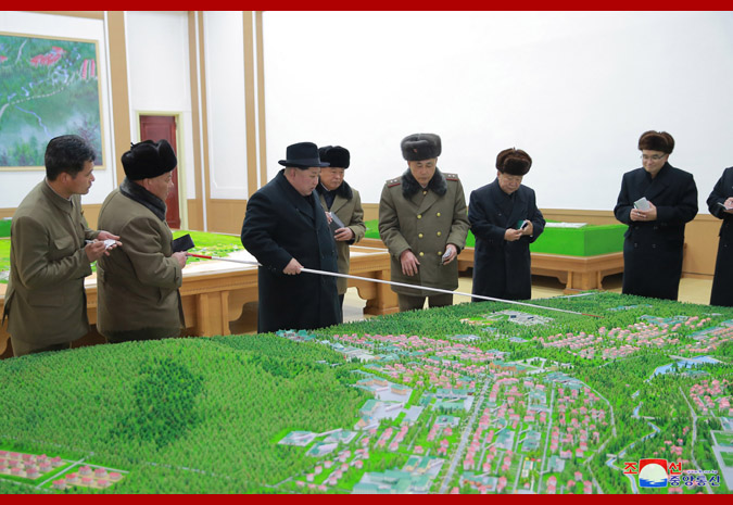 Looking at the model board showing the general plan for building Samjiyon County, he gave important instructions that would serve as the guidelines in sprucing up the county.