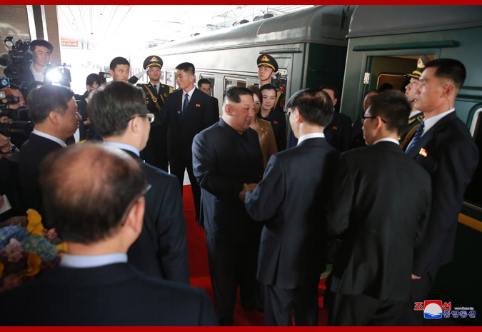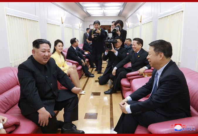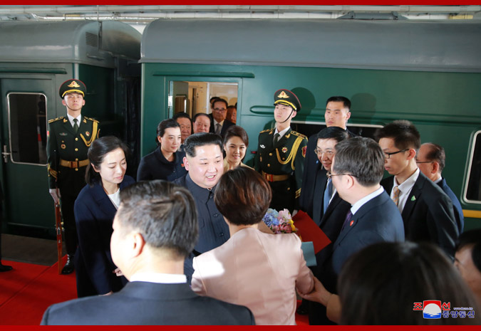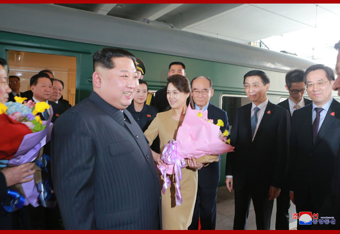 When the special train carrying Supreme Leader Kim Jong Un arrived in Dandong, Song Tao, head of the International Liaison Department of the CPC Central Committee, Chen Qiufa, secretary of the Liaoning Provincial Committee of the CPC, Lu Dongfu, general manager of the China Railway Corporation, Li Jinjun, Chinese ambassador to the DPRK, Liu Huanxin, member of the Standing Committee and secretary-general of the Liaoning Provincial Committee of the CPC, and Ge Haiying, secretary of the Dandong City Committee of the CPC, greeted him.