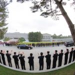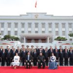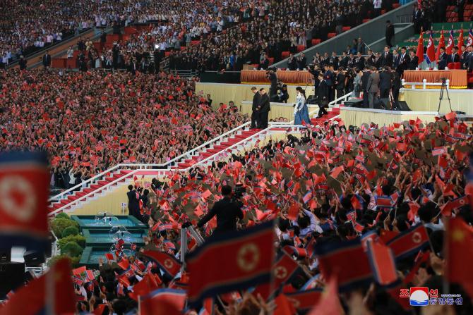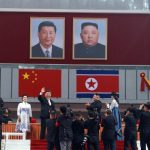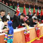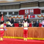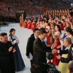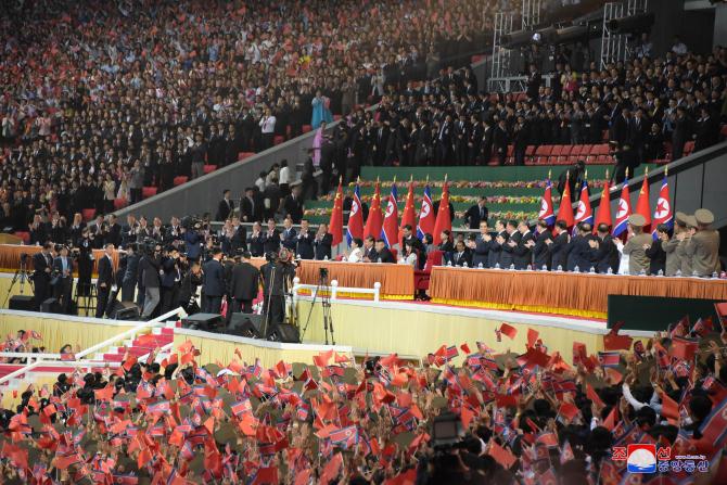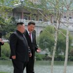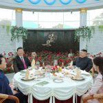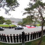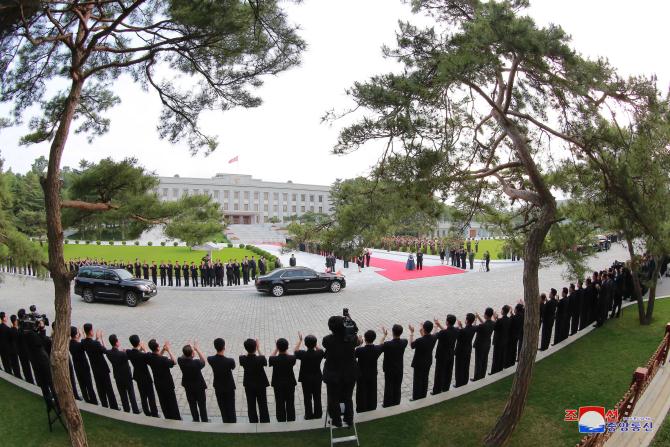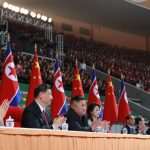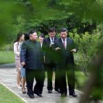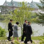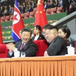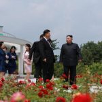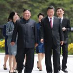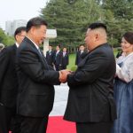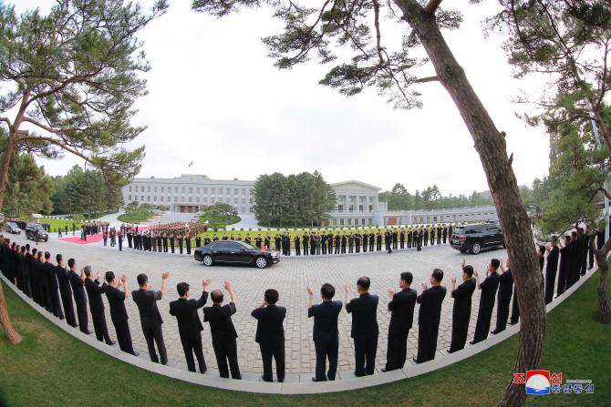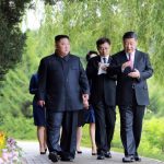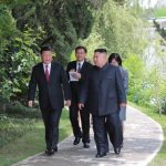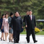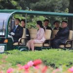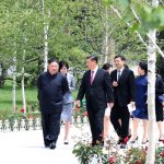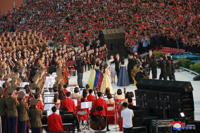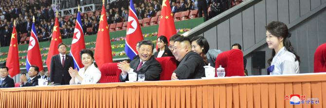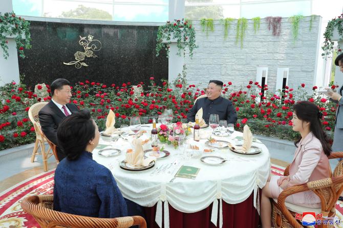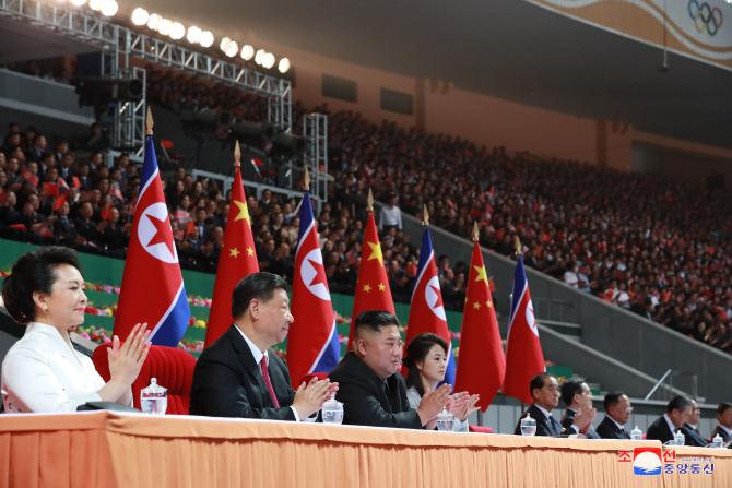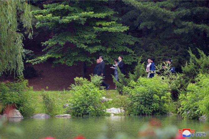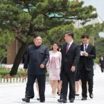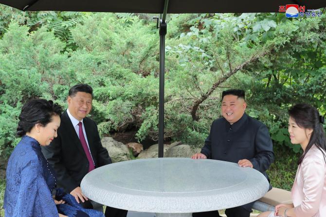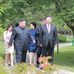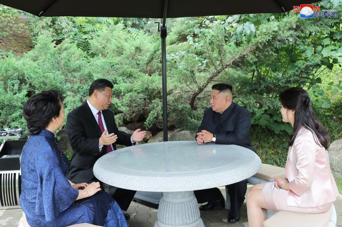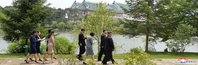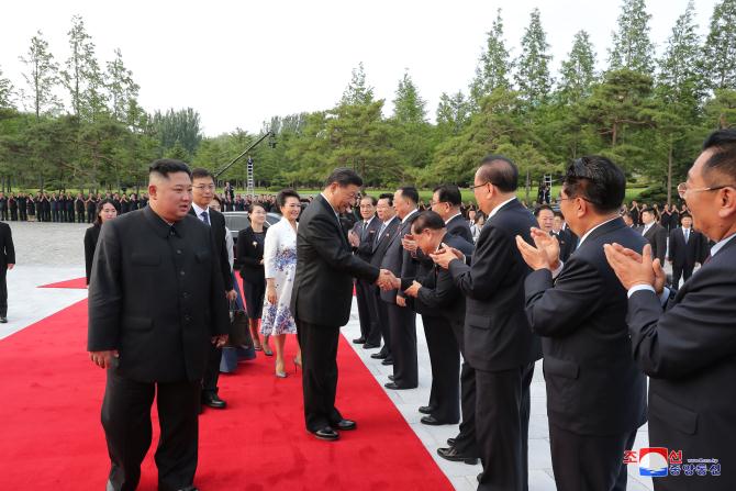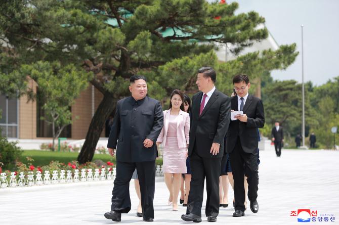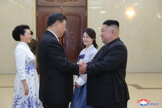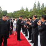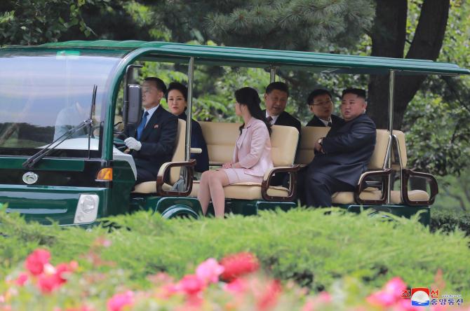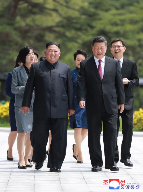 경애하는 최고령도자 김정은동지께서 리설주녀사와 함께 습근평동지와 팽려원녀사를 평양국제비행장에서 환송하시였다.