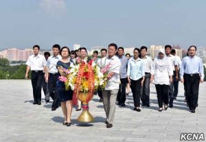 김일성동지와 김정일동지의 동상에 세계식량계획대표부 성원들 꽃바구니 진정