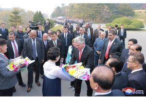 교육위원회 위원장 김승두동지, 대학의 일군들이 미겔 마리오 디아스 까넬 베르무데스동지와 리스 꾸에스따 뻬라싸녀사를 따뜻이 맞이하였다.