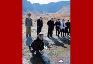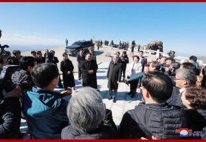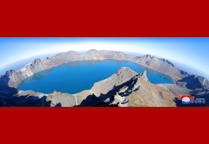 경애하는 최고령도자동지께서는 문재인대통령과 함께 백두련봉에서 제일 높은 장군봉마루에 서시여 웅건장중한 령봉들의 거창한 산악미와 거울처럼 맑고 푸른 천지호반의 장쾌한 전경, 민족의 혈맥인양 련련히 뻗어간 천리수해를 오래도록 부감하시였다.