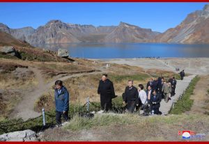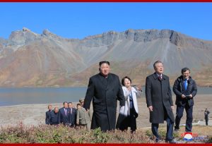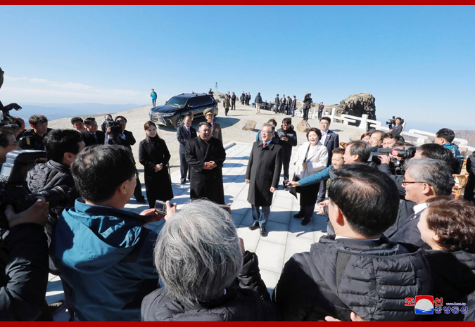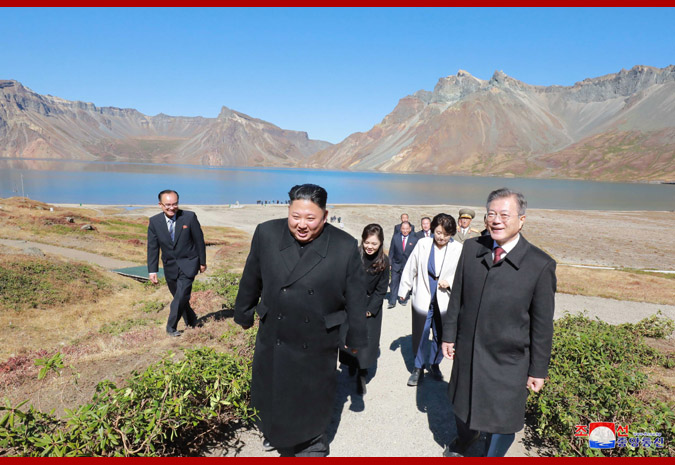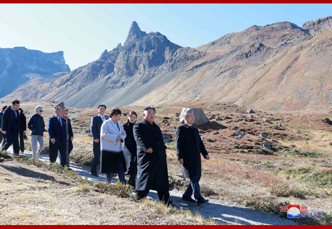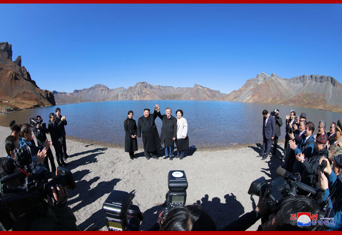 경애하는 최고령도자동지께서와 리설주녀사께서는 문재인대통령내외분과 함께 천지에 내려가시여 호반을 거니시며 백두산에 오른 소감을 나누시였다.