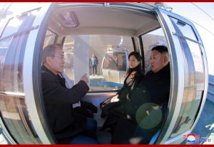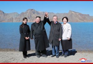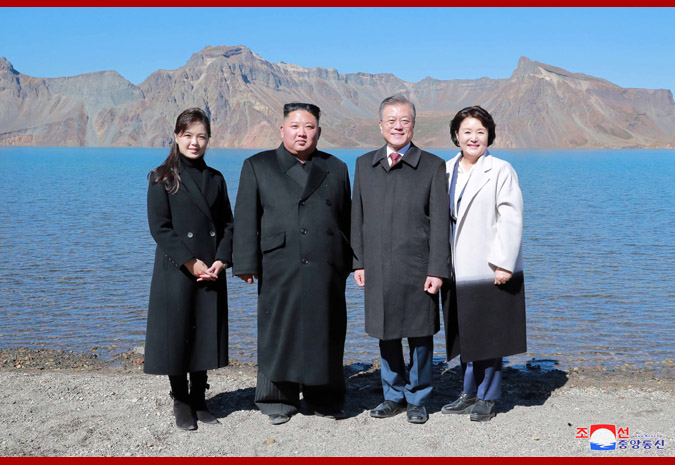 경애하는 최고령도자동지께서와 리설주녀사께서는 문재인대통령내외분과 함께 백두산정에 오른 력사의 순간을 기념하여 뜻깊은 사진을 찍으시였다.