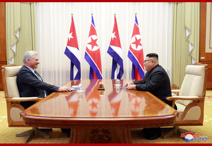 조선로동당 위원장이시며 조선민주주의인민공화국 국무위원회 위원장이신 우리 당과 국가, 군대의 최고령도자 김정은동지께서 4일 오후 꾸바공화국 국가리사회 위원장 겸 내각수상 미겔 마리오 디아스 까넬 베르무데스동지와 회담하시였다.