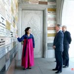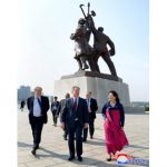 손님들은 위대한 수령 김일성동지와 위대한 령도자 김정일동지의 사상리론적업적에 대한 해설을 들으면서 탑신과 군상들을 돌아보았다.