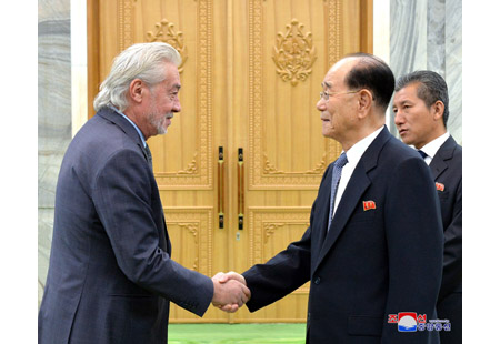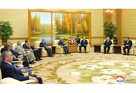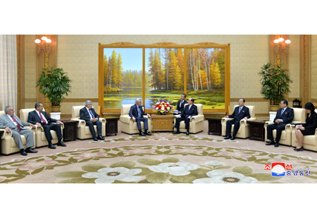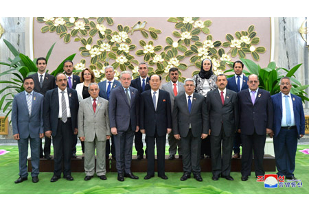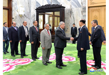조선로동당 중앙위원회 정치국 상무위원회 위원이며 조선민주주의인민공화국 최고인민회의 상임위원회 위원장인 김영남동지는 8일 만수대의사당에서 의례방문하여온 나즈다트 안조르 부의장을 단장으로 하는 수리아인민회의대표단을 만나 담화를 하였다.(끝)