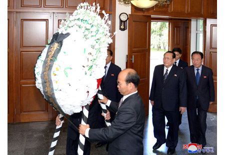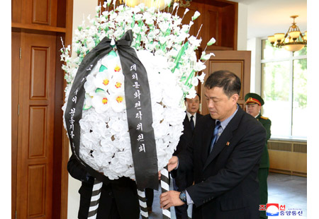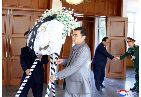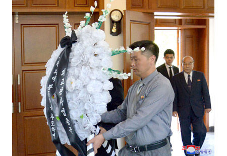 조선민주주의인민공화국 최고인민회의 상임위원회와 외무성, 대외경제성, 대외문화련락위원회, 외교단사업총국의 명의로 된 화환들이 고인의 사진앞에 진정되였다.