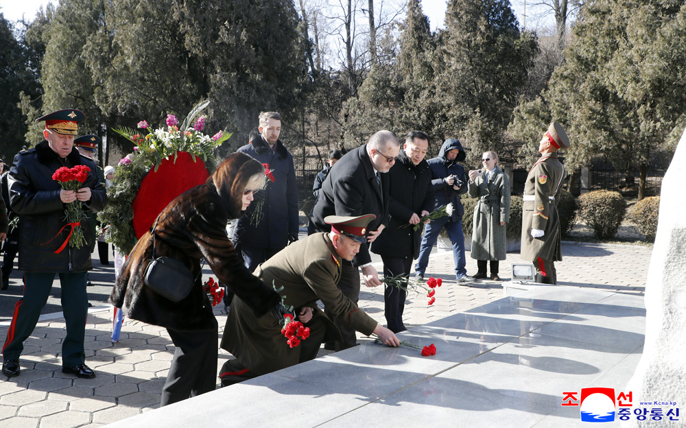 조국수호자의 날에 즈음하여 우리 나라 주재 로씨야련방대사관 성원들이 23일 해방탑에 화환을 진정하였다.