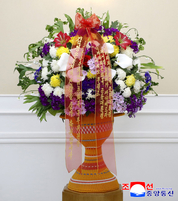 경애하는 김정은동지께서 조선민주주의인민공화국 국무위원장으로 또다시 높이 추대되신것을 축하하여 그이께 다니엘 오르떼가 싸아베드라, 로싸리오 무릴료 니까라과공화국 공동대통령들이 꽃바구니를 보내여왔다.