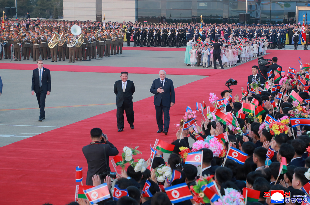 조선민주주의인민공화국 국기와 벨라루씨공화국 국기가 나붓기는 평양국제비행장 정류장에는 조선인민군 명예위병대가 정렬해있었다.