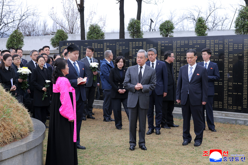 우리 나라를 방문하고있는 중국공산당 중앙위원회 정치국 위원이며 중화인민공화국 외교부장인 왕의동지와 일행이 10일 강동군에 있는 중국인민지원군렬사릉원을 찾아 꽃바구니를 진정하였다.