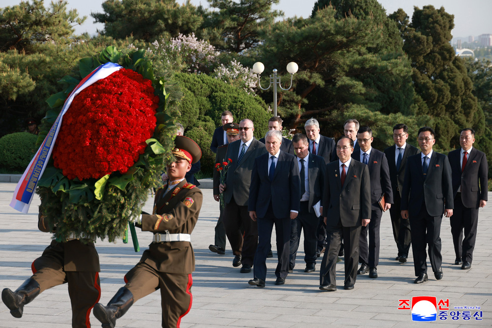해외군사작전 전투위훈기념관 준공식에 참가하기 위하여 우리 나라를 방문하고있는 국가회의 의장 뱌체슬라브 월로진동지를 단장으로 하는 로씨야련방 공식대표단이 25일 해방탑에 화환을 진정하였다.