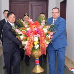 꽃바구니와 축하편지를 5일 외무상 리용호동지에게 외교단 단장인 이스마일 아흐마드 무함마드 하싼 팔레스티나국가 특명전권대사가, 인민무력상 륙군대장 노광철동지에게 무관단 단장인 알렉쎄이 바르뚜쏘브 로씨야대사관 무관이 전달하였다.