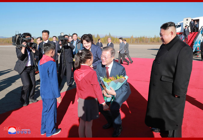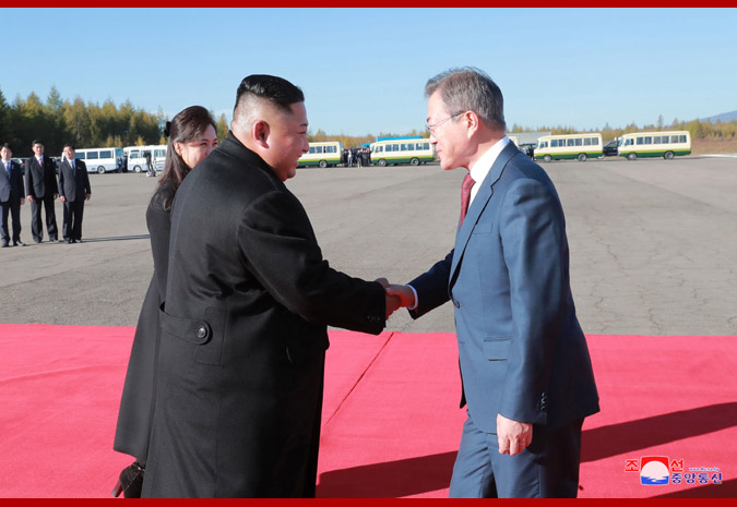 (조선어) 문재인대통령과 일행 삼지연에 도착경애하는 최고령도자 김정은동지께서 문재인대통령을 삼지연비행장에서 맞이하시였다